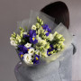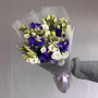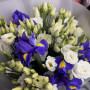 На фото букет из синих ирисов и белой эустомы. В составе: ирис 5 шт, эустома (лизиантус) 6 шт, дизайнерская упаковка 1 шт, атласная лента 1 шт, . Все цветы свежие и ароматные, букет красиво оформлен и отлично подходит для подарка. Доступна доставка цветов или самовывоз.